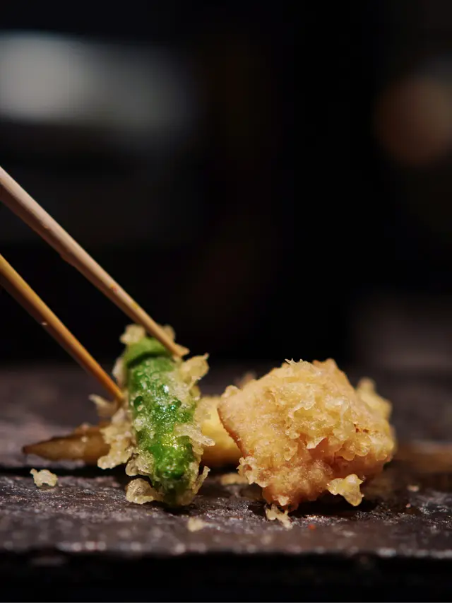 野菜天婦羅,用關東煮的蘿蔔、粟米和青椒,裹上一層麵糊,炸得酥脆,沾上一點鹽或醬油,很爽口。