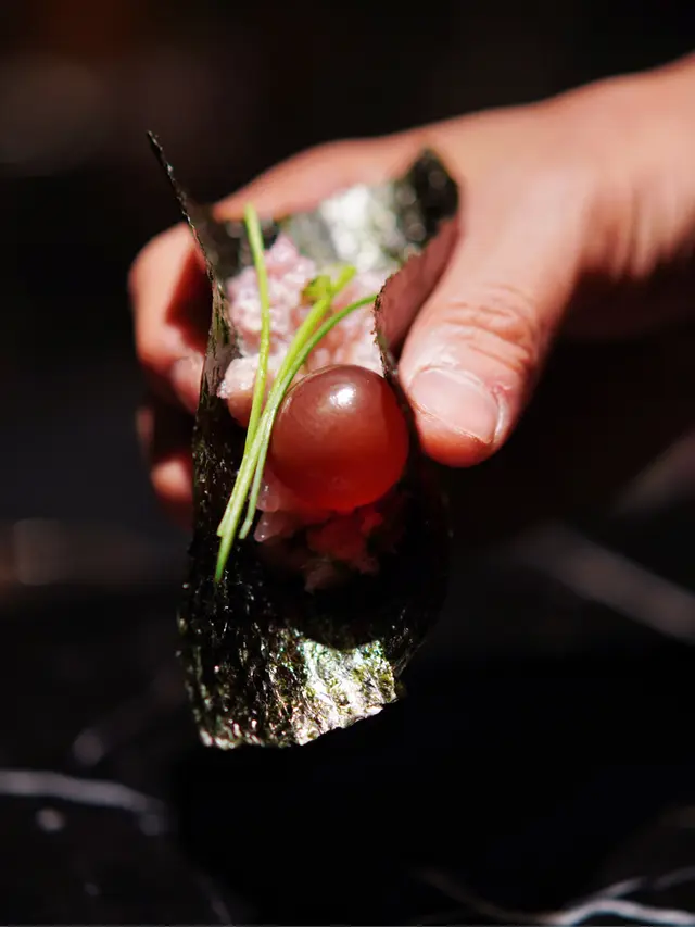 蔥粒吞拿魚提燈,是用吞拿魚肉切成蓉,加上蔥粒而上面放上用醬油漬所處理過的提燈,再用紫菜包住食,吞拿魚的肉很嫩,蔥粒的香氣很濃,兩者的味道很搭,加上提燈獨特的口感。是一款令人上癮的味道。