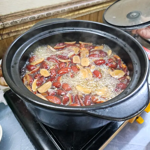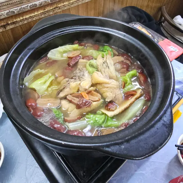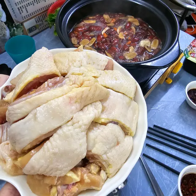 一入座時店員已相當有效率立刻遞上藥膳鍋底及雞件和生菜。 每份雞煲會奉送一份生菜, 如果嫌雞煲花雕味不足可加錢購買多一杯酒。雞份量有大細之分如三個人以下建議選擇細份量就足夠了, 因為雞件切得都幾大件仲好厚肉的👍🏻。鍋底的紅棗份量十足滾起時濃濃的紅棗味感覺似煲緊紅棗水反而失去了部分花雕酒味😅。(水滾時是落雞件的好時機)等大約十五至二十分鐘再滾時就可以進食。 雞件肉質相當嫩滑及新鮮完全沒有冰鮮雪味道, 再沾上餐廳秘製的辣椒豉油更是能令味道提昇到另一層次👍🏻。
