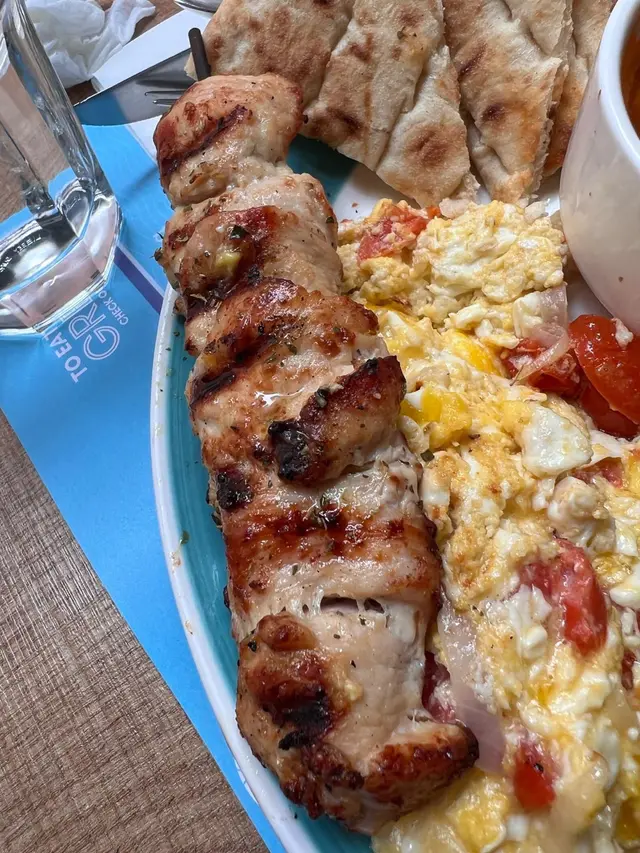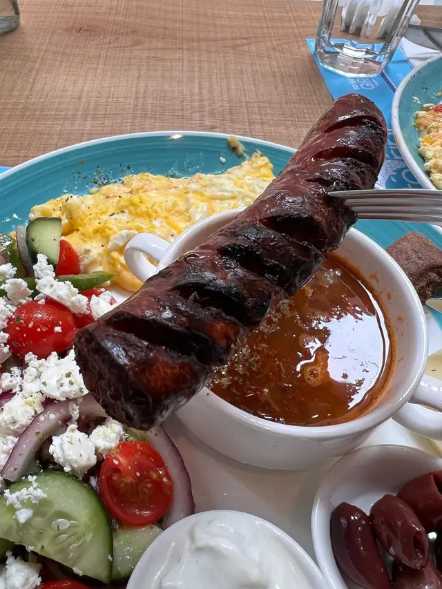 **主菜**含雞肉蘇夫拉基,炭烤後帶檸檬蒜香與紅酒醃料風味;豬肉香腸含茴香籽辛辣;