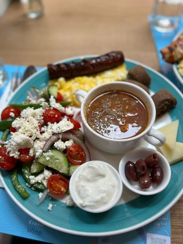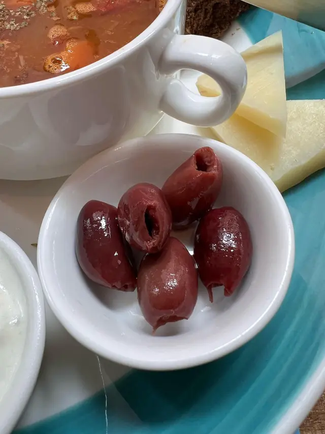 **配菜**包含紅扁豆湯(番茄酸、月桂葉香)、卡拉瑪塔橄欖(紫黑果肉鹹甜)、格拉維耶拉乳酪。