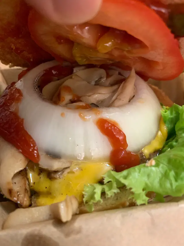 然後,佢牛肉好大塊,有肉汁既;佢個洋蔥圈幾得意,岩岩好困住d蘑菇,蘑菇唔會跌曬出泥,唔知係咪突登設計呢😂。菇好林好香,洋蔥爽甜,蔬菜新鮮,所有野加埋,非常好味!🤤