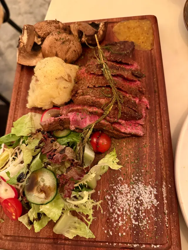 主菜揀咗5成牛,一黎到見咁紅都怕既,但食落都偏淋既。係某啲部分好靭 難啲咬🤣佢配菜都有薯蓉 蘑菇 同沙律菜。但薯蓉食到有薯粒添 有驚喜既😍