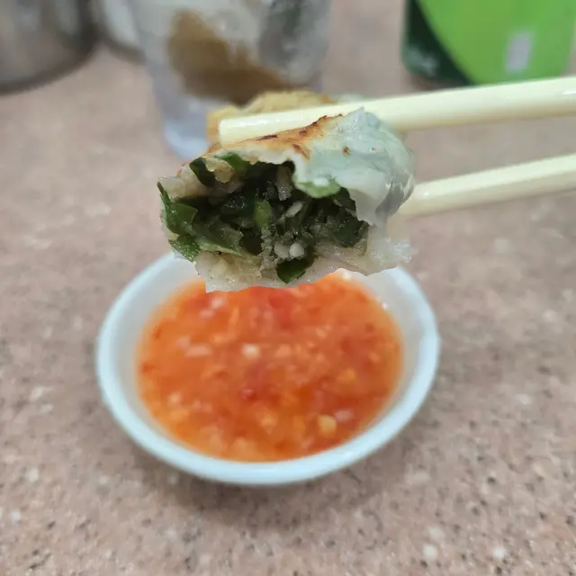 煎餃子雙拼分別是韭菜餃和菜肉餃,韭菜餃裡面的肉餡實在,咬下去有明顯的湯汁感,搭配韭菜的香氣,吃起來特別濃郁,而且餃餡包得滿滿的,整體吃起來咬勁剛好,一口一個韭菜餃大滿足,難怪許多人一買就是一整盒外帶走。