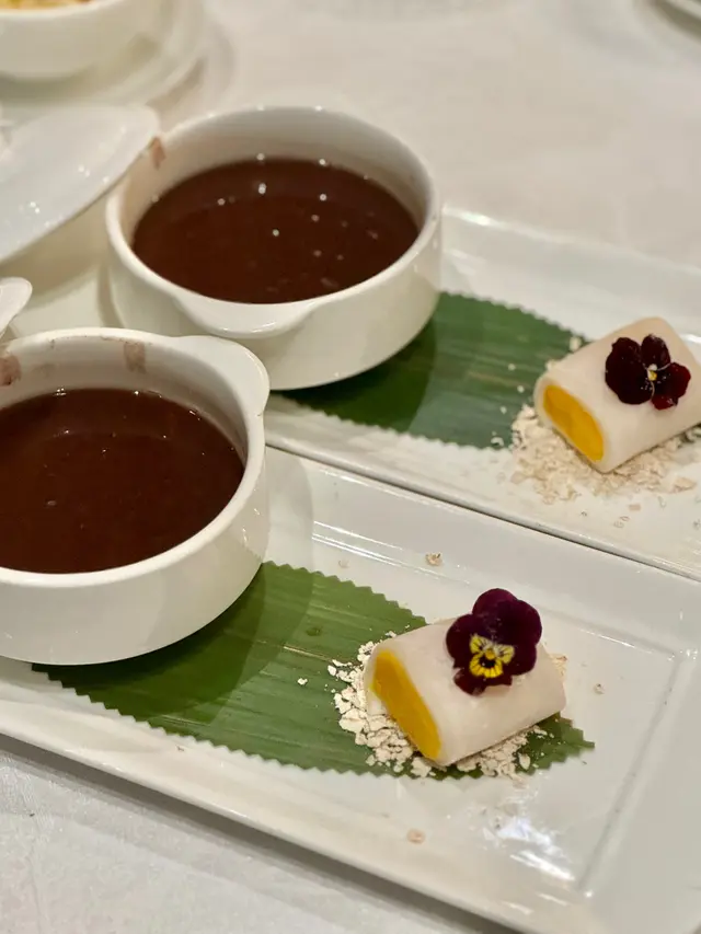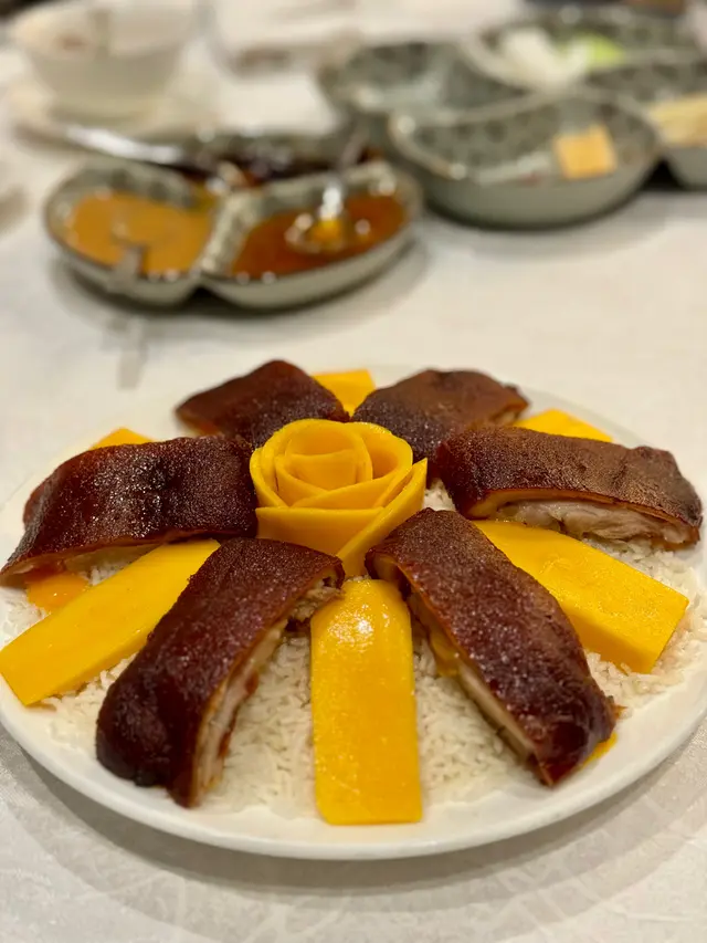 另外試埋中菜廳其中一道招牌菜。乳豬同樣以自家廚房炭火爐烤製,皮脆香口。特別於配搭芒果及脆米,香甜芒果肉減低油膩感,脆米令口感層次豐富。