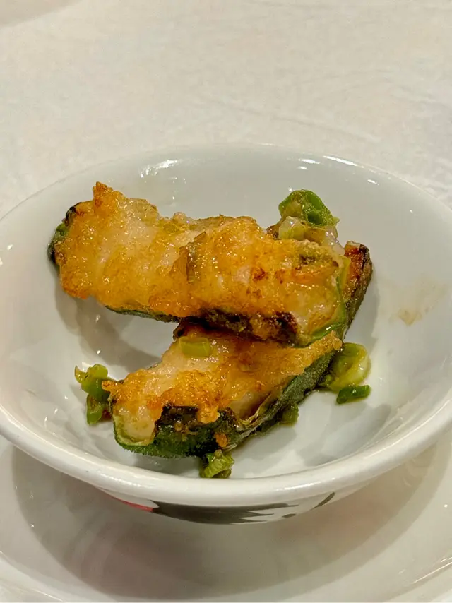 前菜以蝦滑釀秋葵再煎至金黃色,入口香脆,蝦味鮮甜。