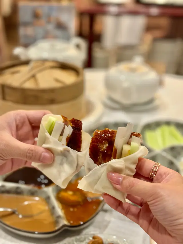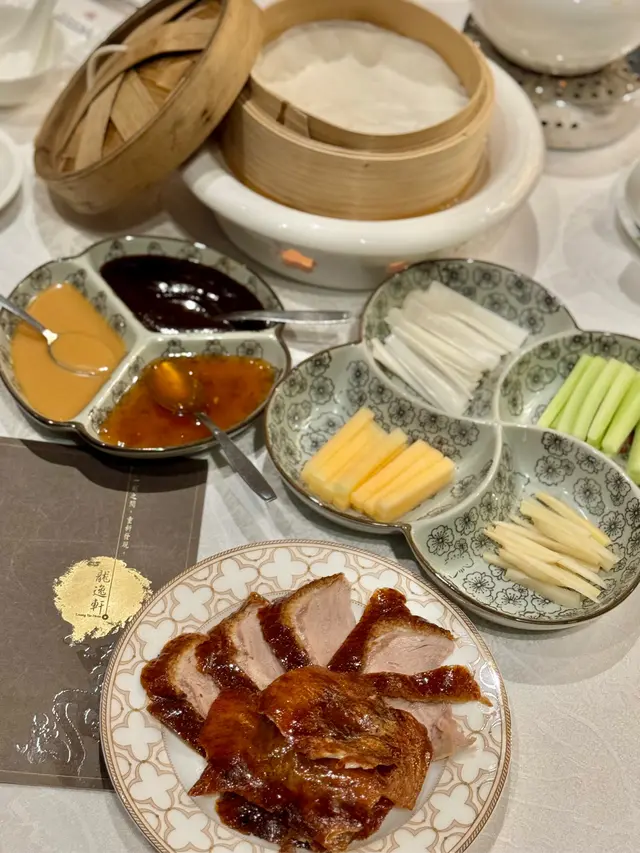 第一食係京式片皮鴨。店員係席前片鴨,烤鴨外皮超香脆,肉質軟腍唔韌。鴨餅皮夠薄身,配搭多種配料及醬料,做出不同口味組合。