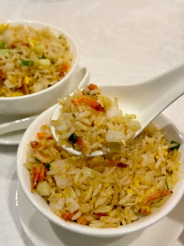師傅用帶子粒、櫻花蝦、蔥花、雞蛋等材料炒飯,飯粒乾爽粒粒分明,蛋味香濃。