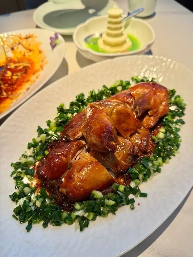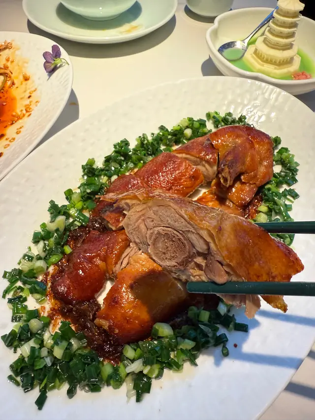 烤鴨皮脆脆,皮下脂肪唔多,唔會油淋淋。肉質鮮嫩多汁,一啲都唔乾鞋,配上圍邊嘅蔥油同埋特製醬料,好惹味。