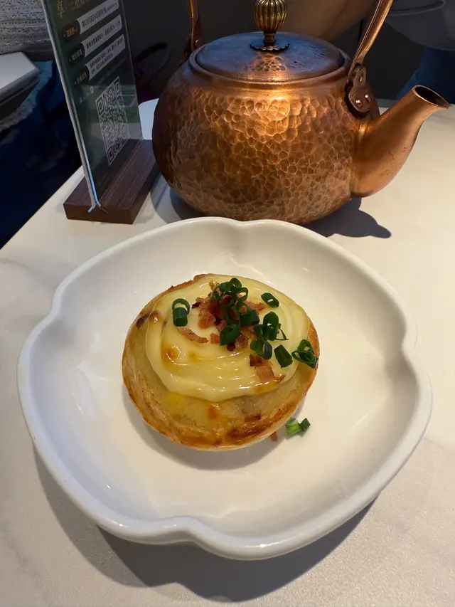 呢個撻係酥皮載滿綿綿仔蓉,係真材實料嘅薯蓉,上面上芝士醬同埋灑上香口煙肉,味道好好。