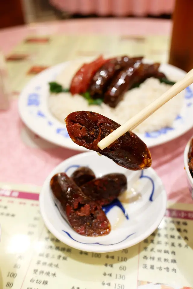 切肉臘腸及鮮鴨膶腸是蛇王芬的招牌之一;精螢通透而帶有焦香的臘腸及肉質幼滑細嫩兼酒香撲鼻的鮮鴨膶腸整整齊齊地舖在香軟白飯上;入口時鮮味四溢,每顆飯粒均被臘腸膶腸的甘香油脂包裹著,啖啖滋味,回味無窮!