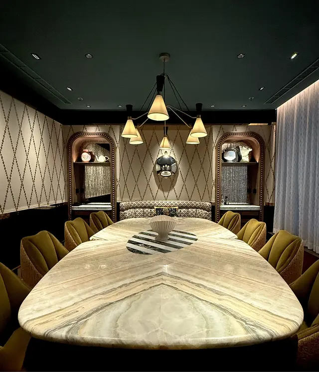 源自1950年代意大利復古美學🇮🇹入到去即刻俾佢嘅華麗細節震懾✨天鵝絨梳化、Fornasetti壁紙嘅花紋、Murano玻璃吊燈嘅柔光💡加上大理石枱面同仿壁爐設計🔱古典得嚟又有現代感👍餐廳名「CITRINO」取自黃水晶💎寓意散發快樂能量💪