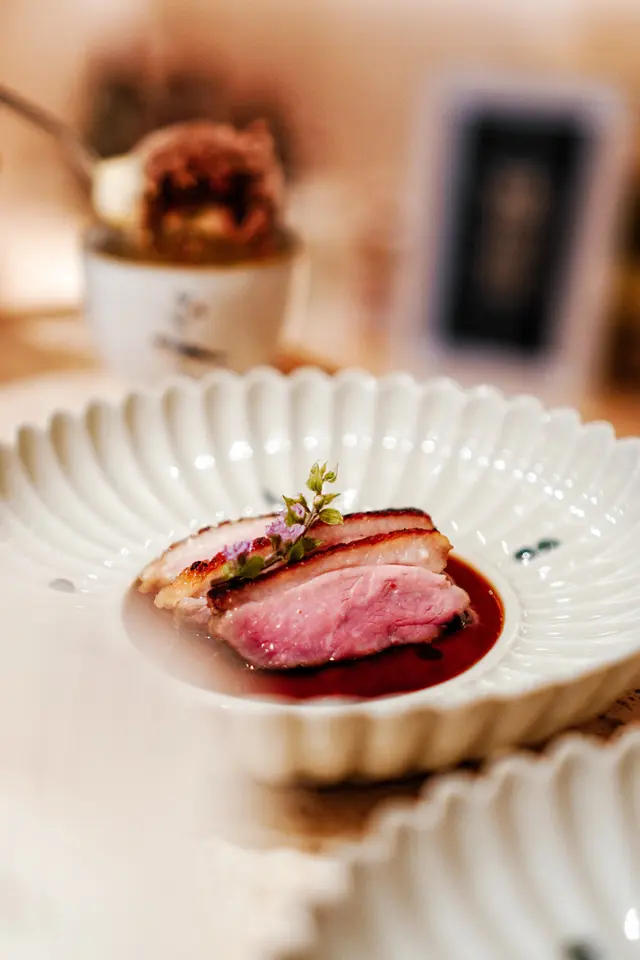 ♥ Duet of Local Duck Breast Marinated in Bean Paste and Confit Duck Leg with Radish and Yellow Bean Sabayon