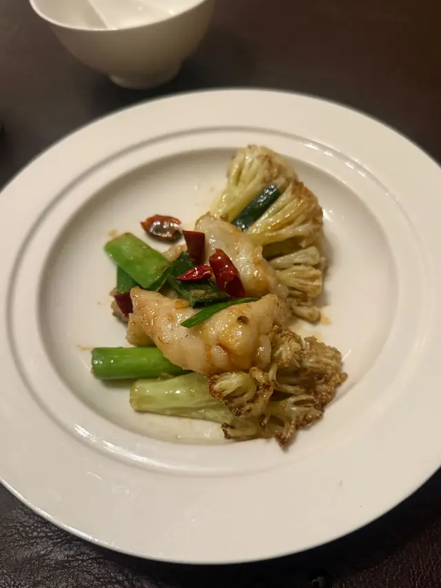 緊接而來的 「乾燒椰菜花龍躉」 則展現了粵菜的另一風貌。龍躉魚塊外皮煎至微脆,內裡肉質卻依舊飽滿多汁,椰菜花吸滿了魚鮮與醬汁的精華,口感爽脆中帶着濃郁。以乾燒方式烹調,醬香撲鼻卻不掩食材原味,微焦的香氣更添風味,讓人回味無窮。