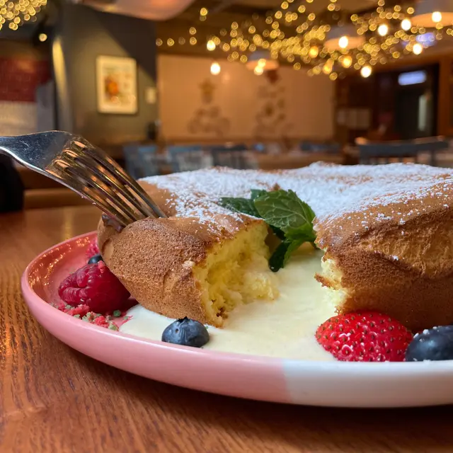 先講重點😜 我最期待嘅甜品pancake❣︎ 即時製作,要等30分鐘都作得嘅😋 香噴噴上檯,陣陣蛋香,一切開~ 芝士奶香迅速流出🥹 我已經流晒口水啦~~~ 食到好滿足呀🥰
