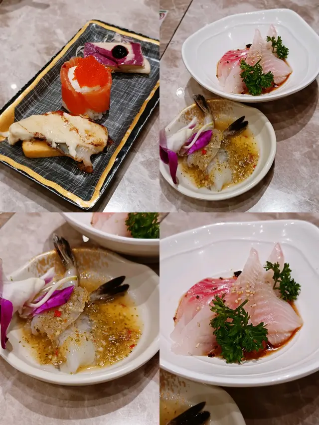 刺身選擇令人驚艷,藍鰭吞拿魚、挪威三文魚、 泰式虎蝦、帶子、珍寶赤海蝦和極尚磯煮凍鮑魚,每一口都帶來海洋的鮮味。