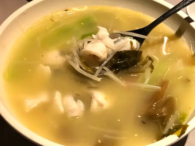 相信酸菜桂魚都是招牌菜,份量十足,除了主角兩斤半重的桂魚之外,更有萵筍、四川出產的酸菜,芽菜等配料,湯頭濃郁但一點也不油膩,用魚湯加泡二荊條辣椒、黃野生椒,煮至湯落魚片上盤,味道要做到酸、鮮、甜的平衡。而魚片鮮滑又厚身,皮細肉嫩,是一款可以喝湯的酸菜魚。