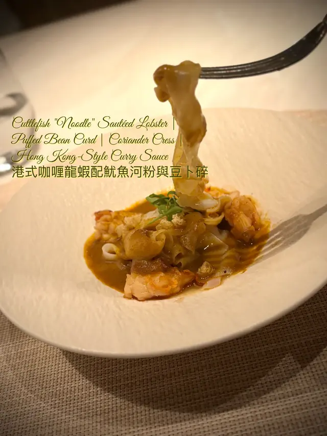 🐙Cuttlefish "noodle" • sautéed lobster • puffed bean curd • coriander cress • Hong Kong-style curry sauce