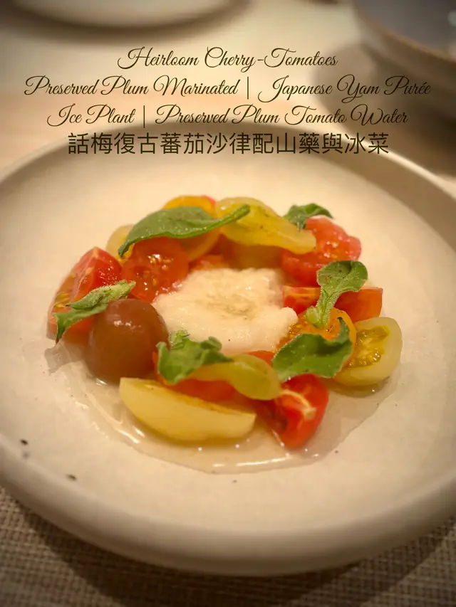 Heirloom Tomato番茄用話梅水醃過,酸甜開胃,最鍾意中間個日本山藥蓉,又滑又清新。冰菜點綴微鹹脆口,更加係畫龍點睛。