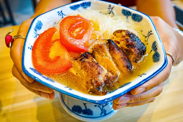 較廣東食開嘅米粉粗身同短身,食落相對煙韌一啲。就咁食無咩味道,不過連埋煎香咗嘅雞扒一齊食就會好啲,另外仲有兩舊蕃茄🍅