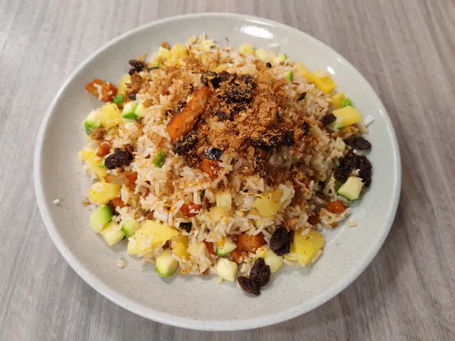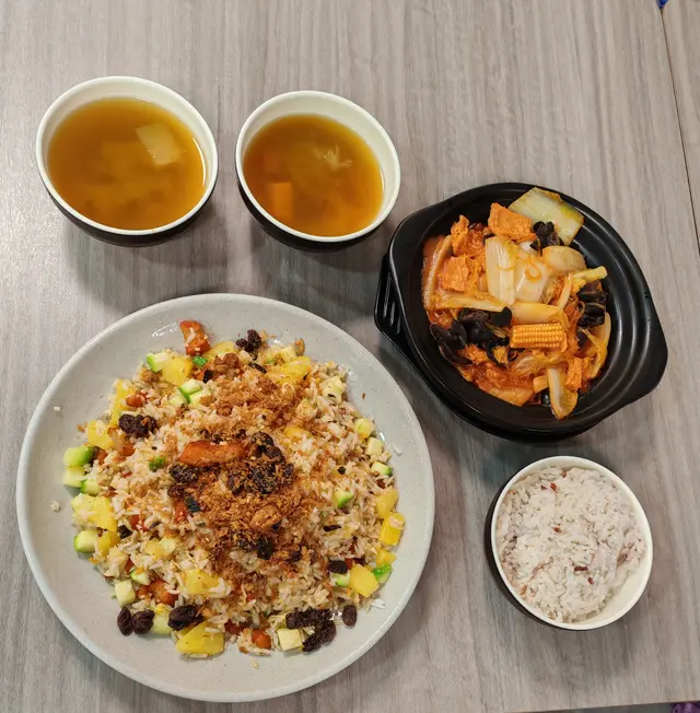 素肉鬆菠蘿炒飯: 飯粒炒得粒粒分明,帶著微微焦香,菠蘿酸甜多汁,與素肉鬆的鹹香,形成鮮明對比,口感清爽而不膩,讓人一口接一口,十分開胃。