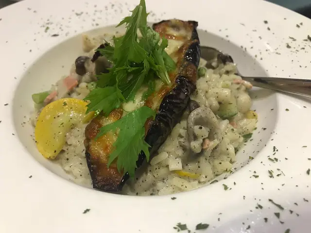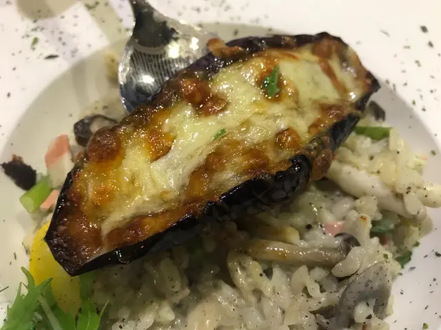 主菜黑松露椰菜花野菌忌廉意大利飯配香烤茄子,茄子面上鋪上芝士焗到金黃色咬落仲有拉絲效味,茄子軟又夠淋加上芝士後香甜,意大利飯內加左素肉扮煙肉幾得意食落真係有少少煙燻味。
