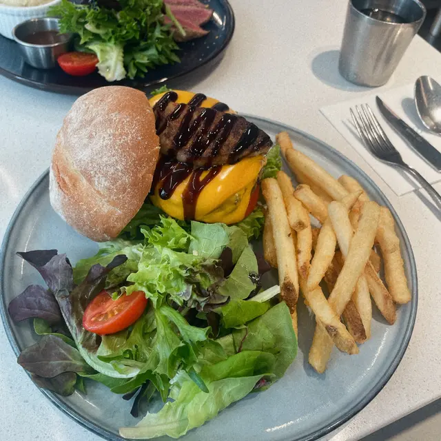 這道菜的味道層次分明,羊扒煎得剛剛好,表面微微焦香,內裏卻仍保持嫰滑,散發出羊肉的獨特香氣。搭配的芥末薯蓉意想不到地柔和,淡淡的芥末味與濃郁的奶香混合,與羊扒形成完美的味道對比。鵝肝牛肉漢堡配薯條