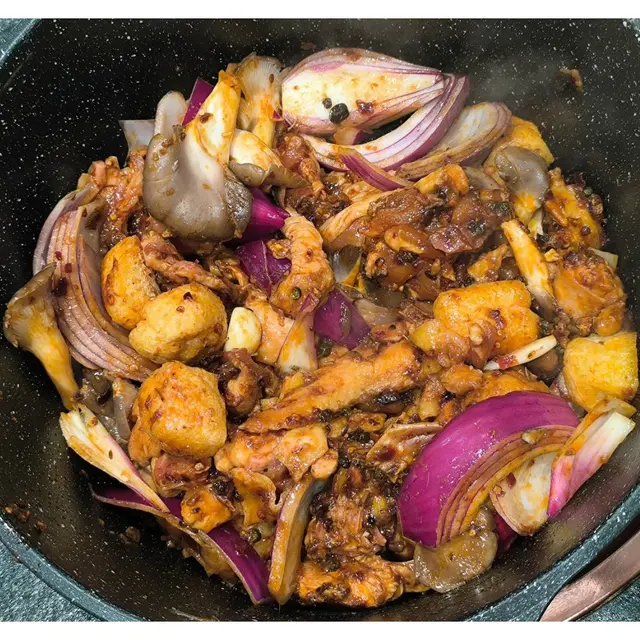 首先食雞煲,揀咗少少辣,少少甜之中帶辣,辣之中帶少少麻,雞件肉質好嫩滑,入面仲有紫洋蔥、菇類同豆卜等。一開始仲要學廚師咁每兩分鐘炒一次,要炒四次,一共無咗八分鐘,如果廚房煮好哂雞煲就好!