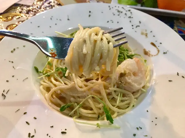 主菜就揀咗鱈魚子蝦肉蛋黃醬意大利粉 ($88), 3粒大蝦肉, 再加豆苗喺面, 賣相簡約清新.