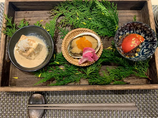 非常精緻的擺碟,包了京都豆腐配蟹肉、鮑魚和番茄。鮑魚非常細心,是切了4塊上,方便食之餘,亦好夠凍,配上大粒魚子好鮮甜。