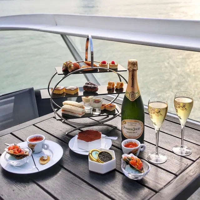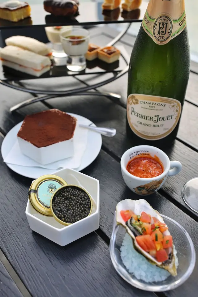 食客可選在室內或室內享用下午茶;香港的冬天下午清涼舒適,好天氣的話很推介在室外用餐!這次下午茶的鹹點包括可配 pancake 享用或淨食的阿穆爾河魚子醬,並有20g之多;每位水煮法國芬迪奇蠔伴檸檬香草汁,鮮濃美妙的泡沫冰島淡水龍蝦湯、濃郁細滑的水牛芝士奶凍伴番茄莎莎醬,還有黑松露牛肝菌撻及煙三文魚青瓜三文治,可謂落重本!