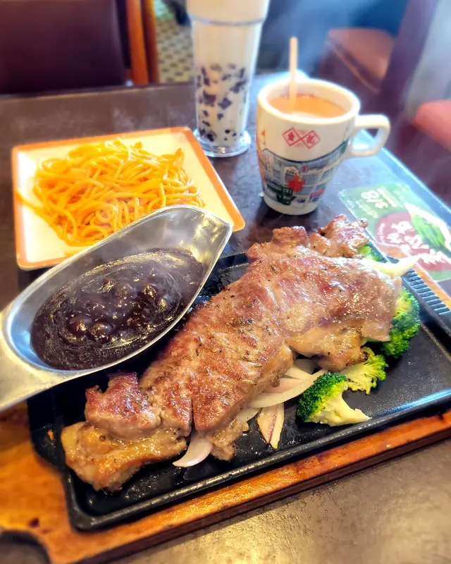 🐄鐵板西冷牛扒意粉配黑椒汁:滋味得來又抵食🔥,西冷牛柳煎得好靚,好厚肉,juicy多肉汁,而且重牛味!套餐包了餐湯和飲品。