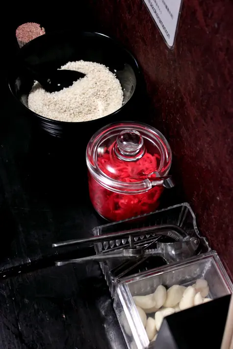 檯上有白芝麻、漬物、蒜頭等,隨你添加,不過,除非那碗拉麵太難吃,否則,我會對它們都視而不睹。