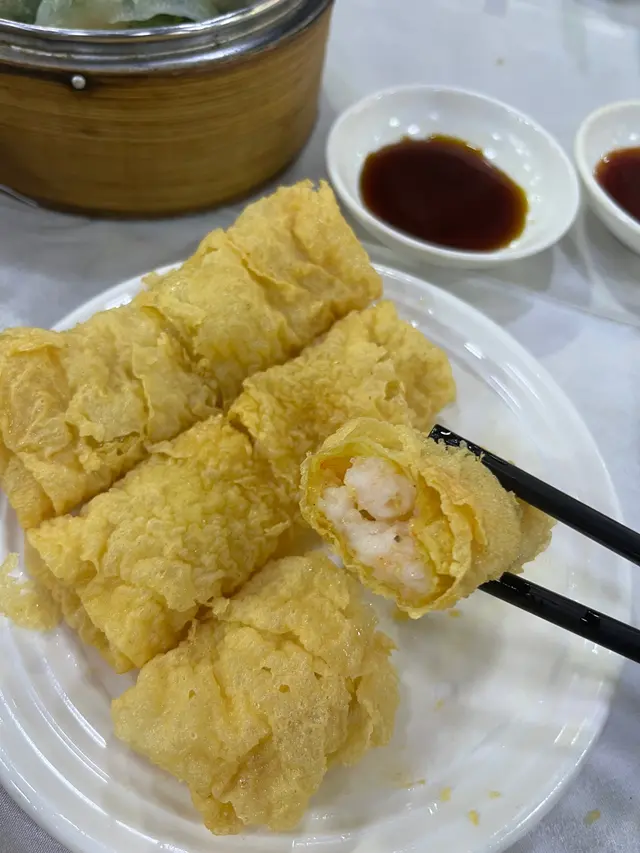 鮮蝦腐皮卷用新鮮腐竹皮包住鮮蝦,再即炸至外層酥脆,配埋喼汁~咬落鬆脆可口
