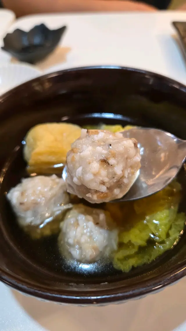 四喜烤麩內裡軟糯,吸收了濃郁的醬汁,燒飯團外焦內軟,檸茶一個人已經食晒兩個,素丸湯清而不淡,湯底以蔬菜熬製,帶出自然的鮮甜,搭配Q彈的素丸。