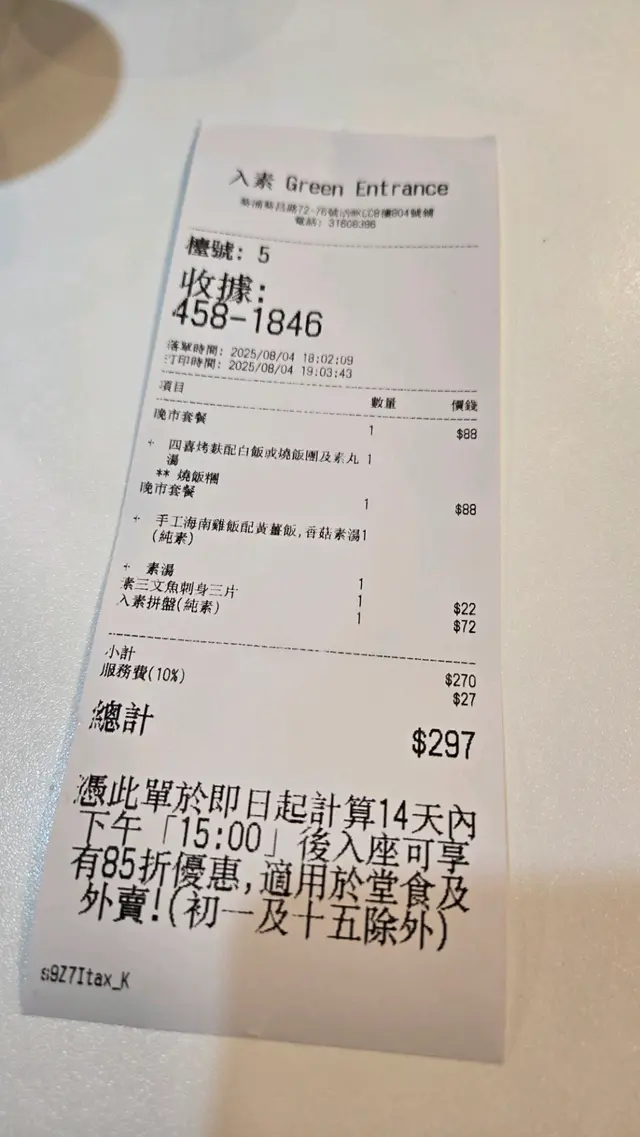 我地去左8樓既「入素」,係一間以純素料理為主打既餐廳。我地嗌左兩個晚餐再外加拼盤及小食。