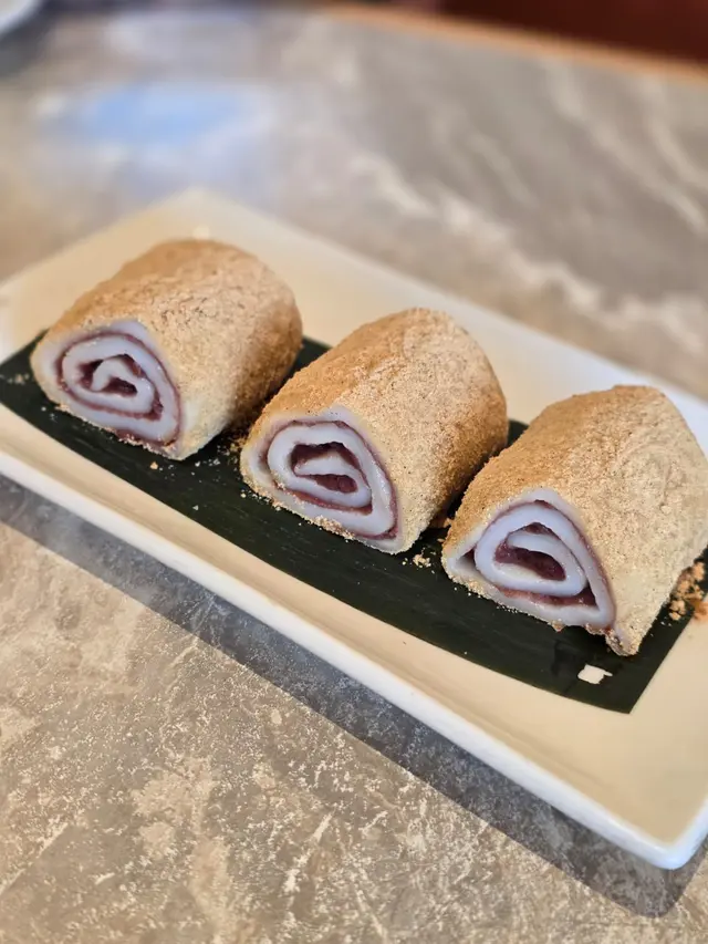 超好味嘅必點甜品,驢打滾係源自中國清朝宮廷嘅傳統點心,以糯米為皮,內捲紅豆餡,再裹上炒熟嘅黃豆粉,因其外觀神似毛驢係地上打滾後沾滿塵土而得名,故又稱「豆麵糕」! 口感煙韌但係唔會黏口,紅豆餡比例啱啱好,冇遮蓋到黃豆粉嘅香味, 仲要夠凍👍 呢個甜品一定要試,食咗幾次都保持到水準👏