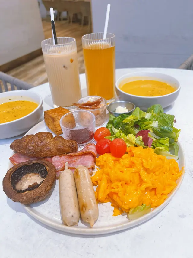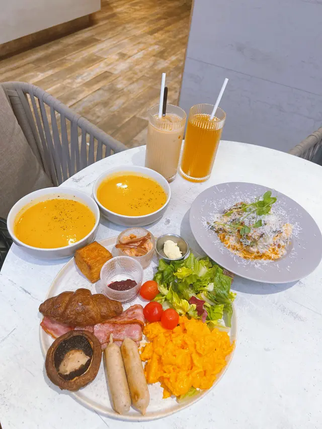 我地點左Set dinner - 主菜係All Day Breakfast同臘肉臘腸卡邦尼新鮮扁意粉,配餐湯周飲品