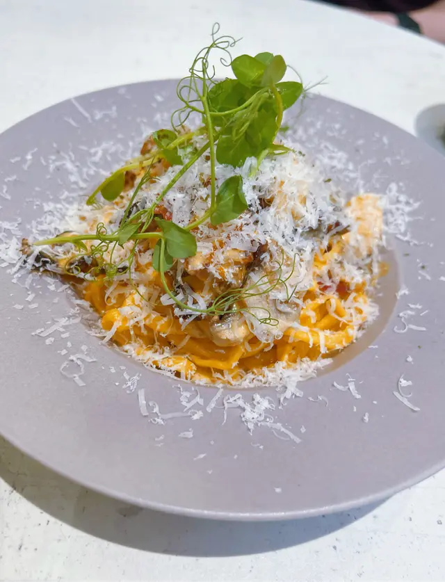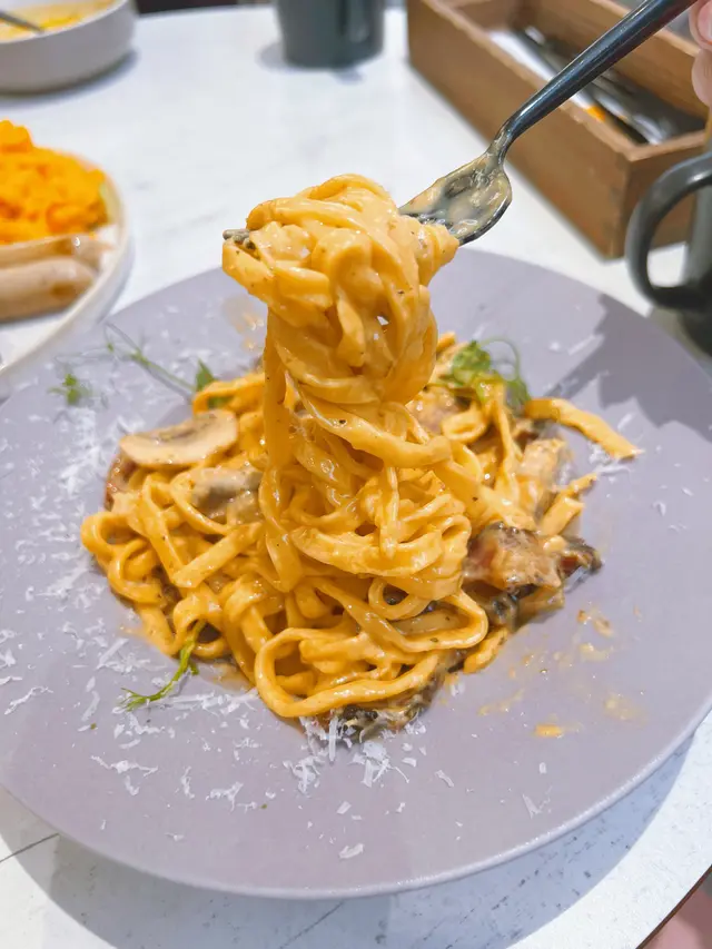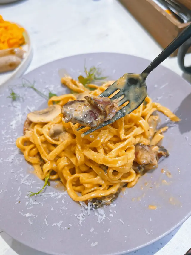 臘肉臘腸卡邦尼新鮮扁意粉幾特別,用上臘肉臘腸其實就似中式煙肉咁!手造扁意粉有口感,吸收哂醬汁夠入味,本身灑上左大量芝士粉
