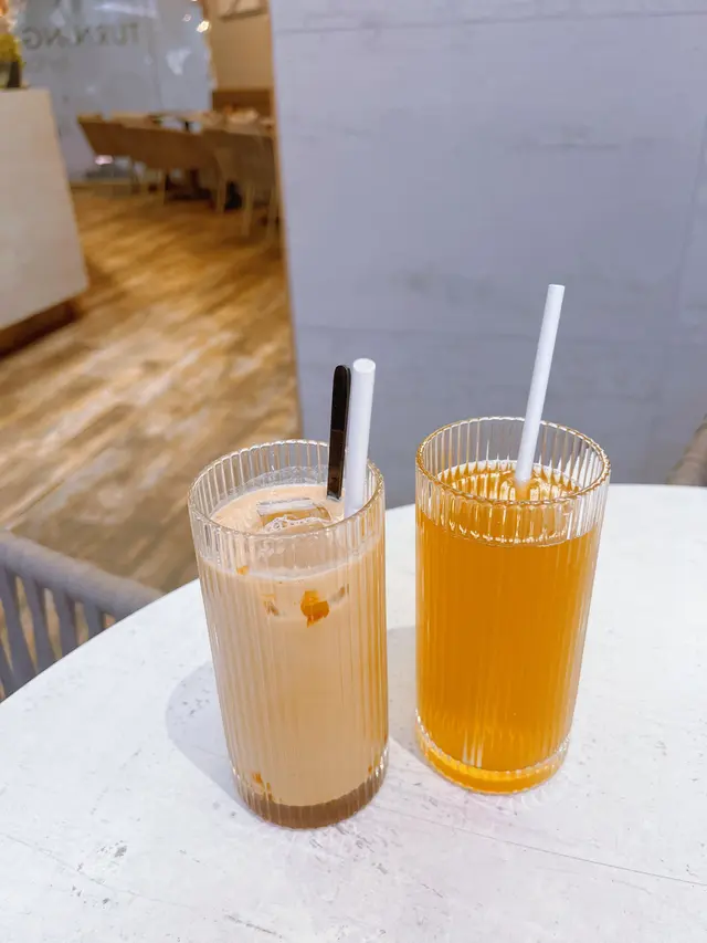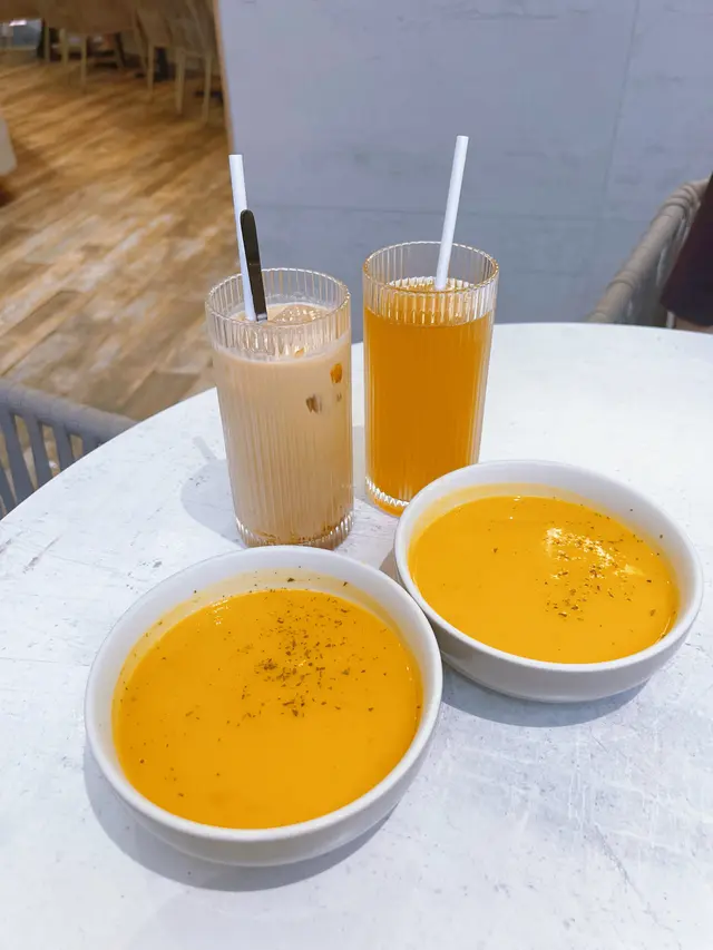 是日餐湯係南瓜湯,我地一杯飲品係跟餐配既凍冷泡茉莉綠茶,茶味清香,另一杯就叫左太妃糖拿鐵咖啡,即係加左拖肥糖醬既Latte,幾得意