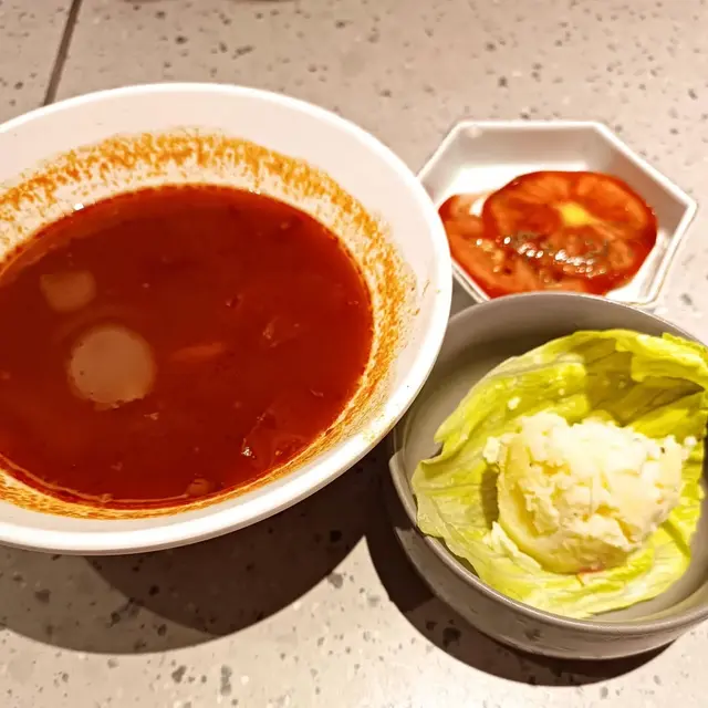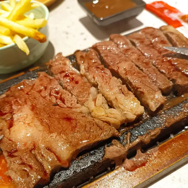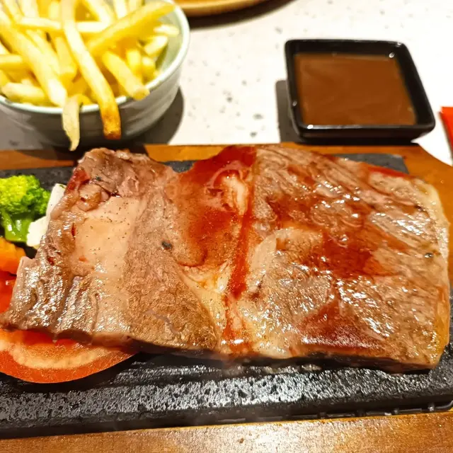 當晚晚餐選擇都好多,小編揀咗燒汁肉眼扒配薯條。依個set包埋是日餐湯、前菜小食同特式沙律,所以都飽肚㗎!今次餐湯係酸酸甜甜嘅羅宋湯,睇得出蔬菜底都算多。前菜就係兩片稍微調味過嘅蕃茄,好清新爽口。沙律就名乎其實充滿特色,係薯蓉溝紅蘿蔔粒,好味到好想單嗌多碗食😍小編牛扒揀咗三成熟,咁啲肉就無咁易喺塊鐵板上面overcooked~肉質方面就好juicy,連埋少許肥油一齊食都十分香口~ 薯條就略微鹹咗少少。紅豆冰就揀咗多奶少冰,入口好香滑,而且紅豆量都多。留意返餐廳係走管餐廳,所以無飲筒提供♻️