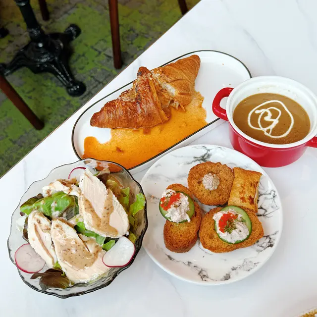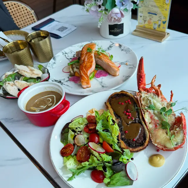 鹹甜點方面,我最鍾意佢哋個龍蝦湯流心牛角包 🥐,切開真係有流心㗎!仲有蟹肉沙律多士同埋好特別嘅健康炒蛋白,食落零負擔。今次仲試咗個牛油果流心蛋牛角包,個配搭出奇地夾!朋友仲加咗$88叫咗個威靈頓牛柳配芝士焗龍蝦,睇到我都流口水~ 🤤
