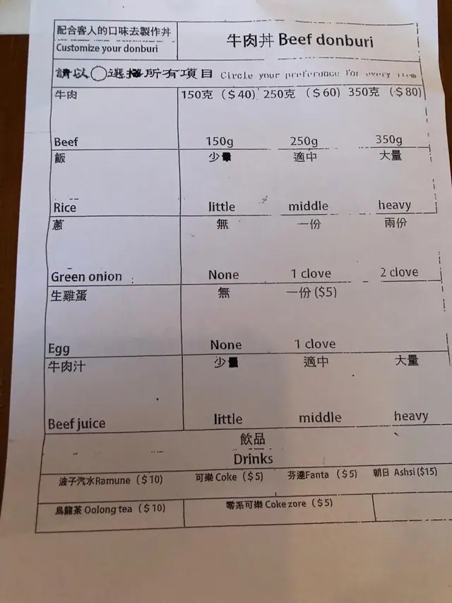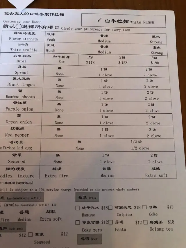餐廳只有3款選擇,牛肉丼、極牛拉麵、白牛拉麵,因為我為牛骨湯慕名而來,所以只點了白牛拉麵,每張點餐紙可因應個人喜好選擇,而侍應亦提醒我們,不太建議點太多配菜,因為太多會影響牛骨湯個味道。