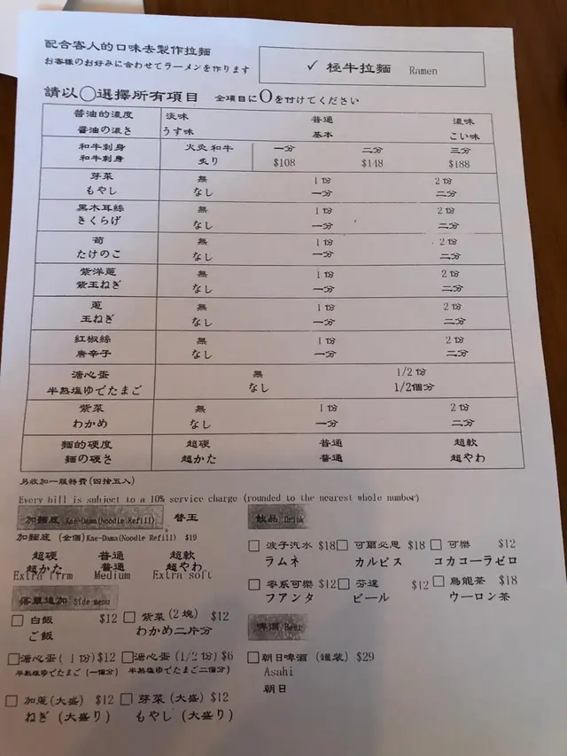點餐紙醬油濃度亦可選擇,有淡味、普通、濃味,配菜有芽菜、黑木耳絲、荀、紫洋蔥、蔥、紅椒絲、溏心蛋、紫菜,可以選一份或二份,溏心蛋和紫菜唔夠食亦可加錢追加,另外麵的硬度亦可選擇,最後和牛可選擇刺身或火炙