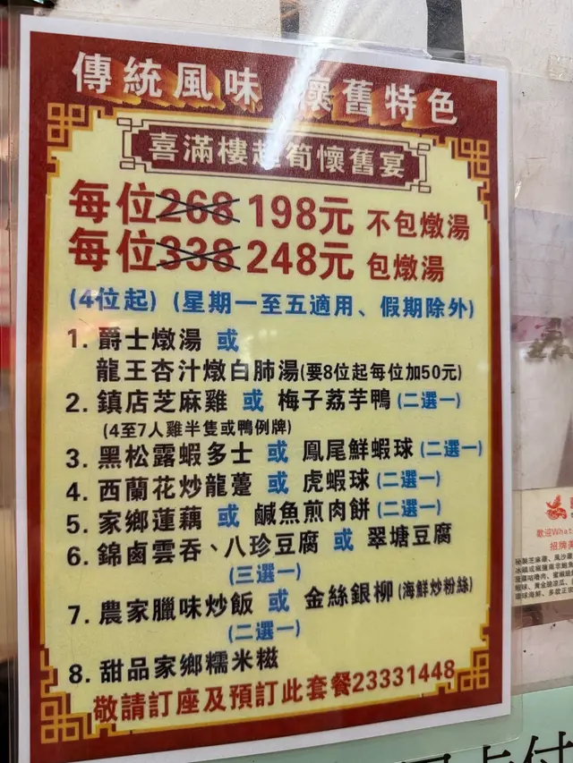 「喜滿樓超筍懷舊宴」每位$198(不包燉湯)/$248(包燉湯)💰,四位起,星期一至四適用(假期除外)。想食記得要訂座時預訂套餐📞。