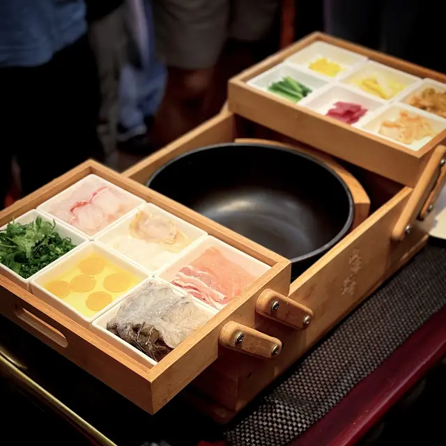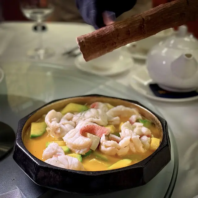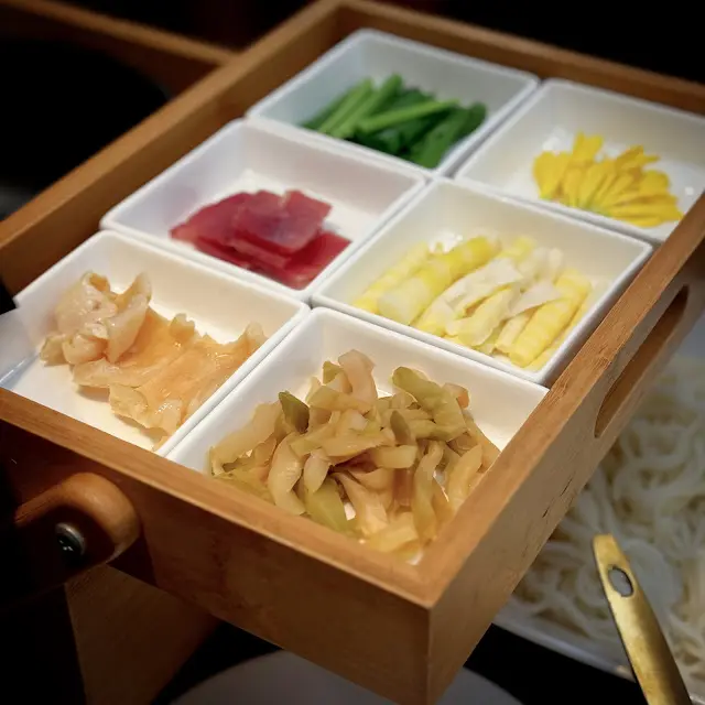 經典過橋米線$538/4位用!派頭十足材料非常豐富,內裏分別有宣威火腿、花膠、鮑魚、酥炸肉、土雞、鮮蝦、黑毛豬豚肉、食用菊花、韭菜、榨菜、芫荽及青蔥。