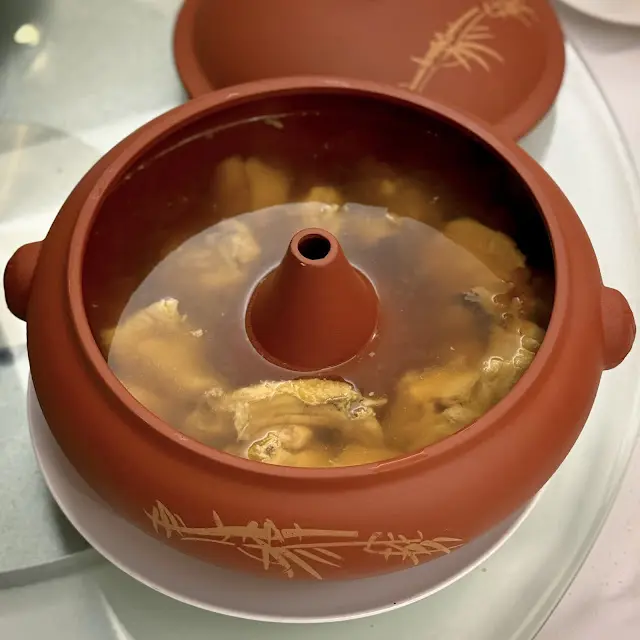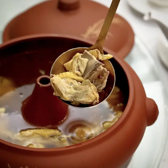 石斛花古法汽鍋雞$488可供四至六位享用!以存味的陶器鍋蒸製特別富風味,滋陰養胃的石斛花略帶青草香氣,湯汁清亮肉嫩味香滋補至極。