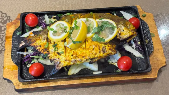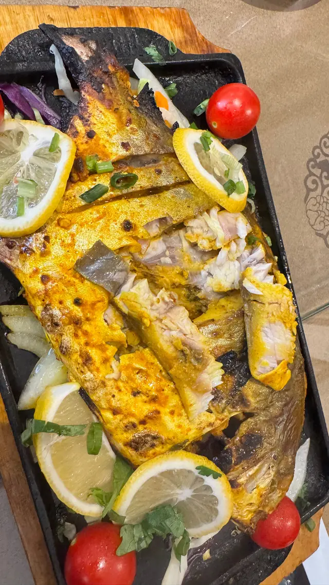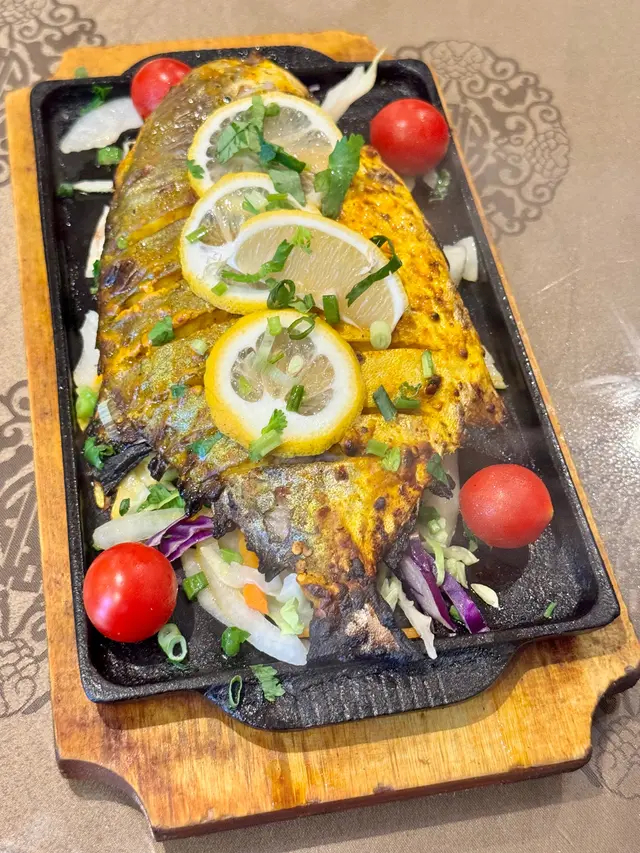 $158「香烤銀鯧魚BBQ Fish Pomfret」:鯧魚鐵板上,鯧魚肉質幾鮮嫩,仲配有檸檬、車厘茄 等,咁樣食落又清新啲🤣