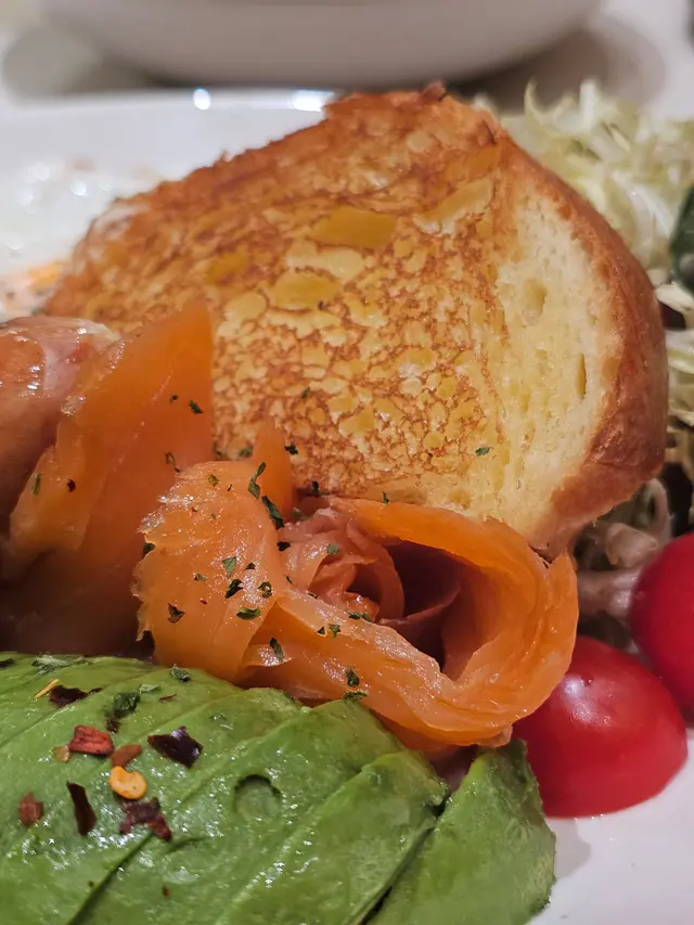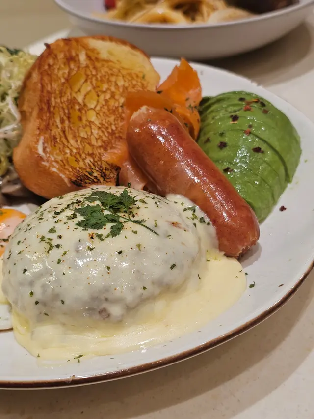 ➡️超豐富的全日早餐,肉汁滿滿的漢堡扒上淋了芝士醬更好食、咸香的煙三文魚、新鮮的牛油果、蘑菇、車厘茄、沙律菜,每款食物都新鮮味美,值得下次再Encore