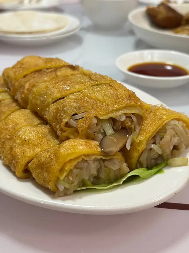北方菜裡面嘅春卷,外皮不是脆口而是雞蛋加麵粉的蛋皮,蛋皮金黃香口,再配上雞肉、芽菜、韭黃、冬菇等食材,以喼汁點綴驚喜好味